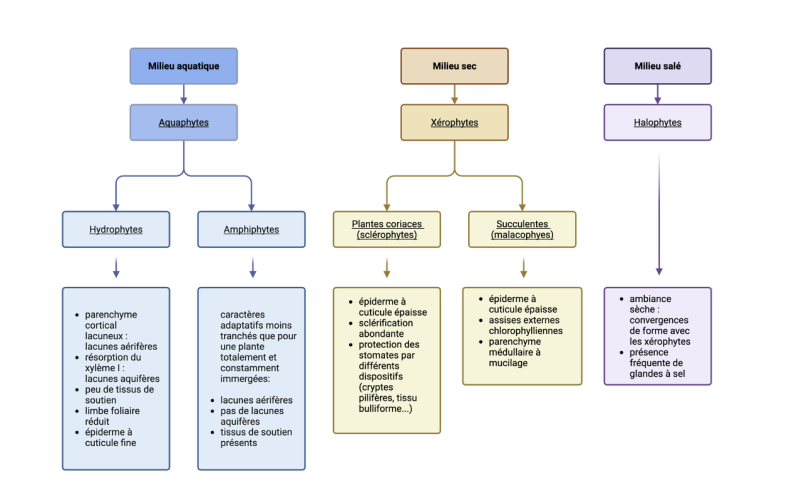- l'adaptation au milieu sec : les xérophytes (les sclérophytes et les succulentes) ;