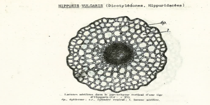 - parenchyme cortical avec des grandes lacunes aérifères (aérenchyme), air à l’état gazeux