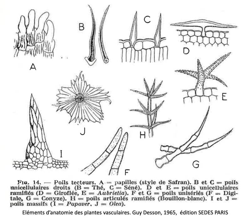 Les épidermes de nombreuses plantes portent des poils (ou trichome) à structure et forme variables :